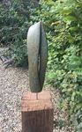 2016Heerlijke mergel steen, rustig van kleur met hier en daar een klein schelpje of fossiel dingetje wat het heel levendig ,spannend maakt. De steen staat buiten en is inmiddels groen geworden.